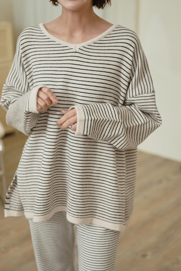 隨興V領細橫紋針織上衣(有開衩)