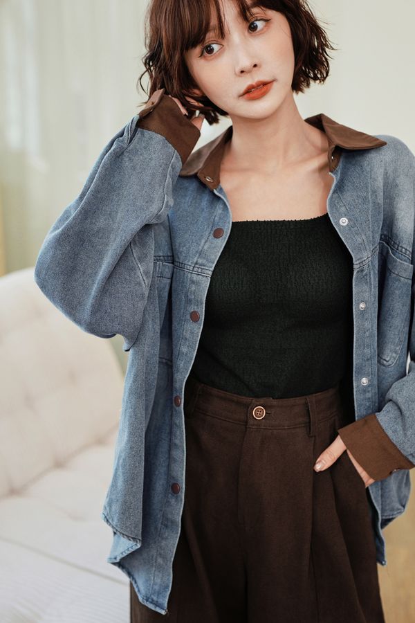 咖啡撞色牛仔壓釦外套