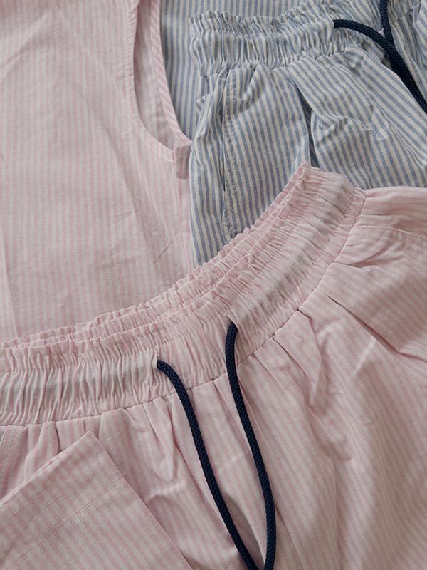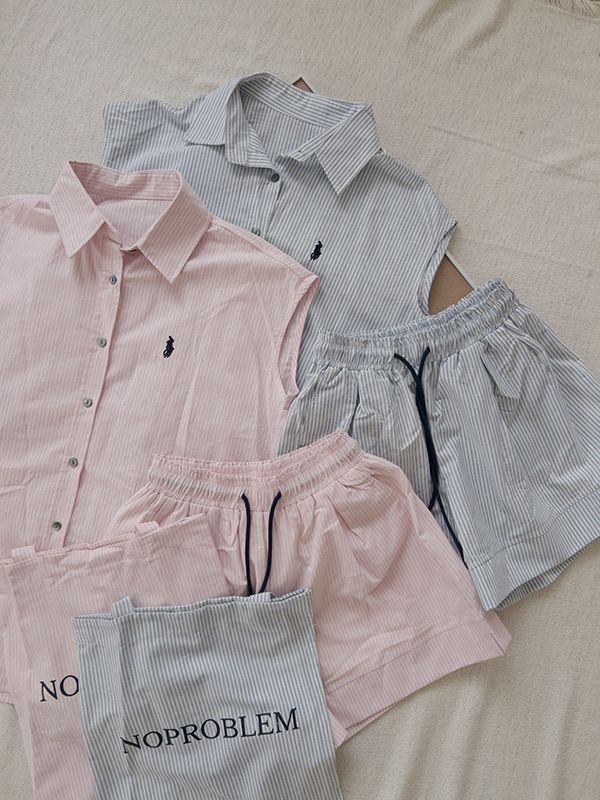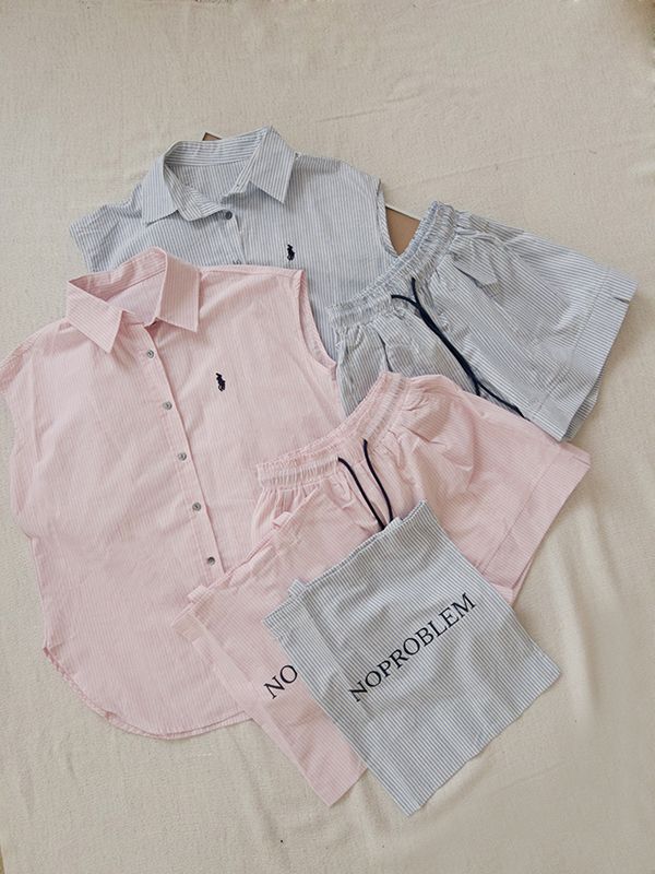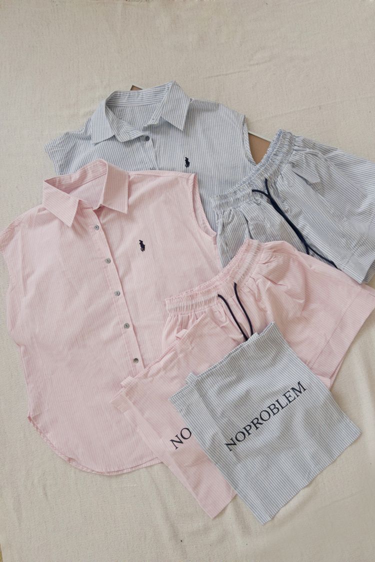 【限量現貨】條紋無袖襯衫+抽繩短褲(附字母提袋)