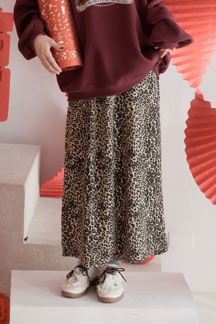 【東京旅拍】水洗豹紋抽繩直筒中長裙(全鬆緊/XL可穿)