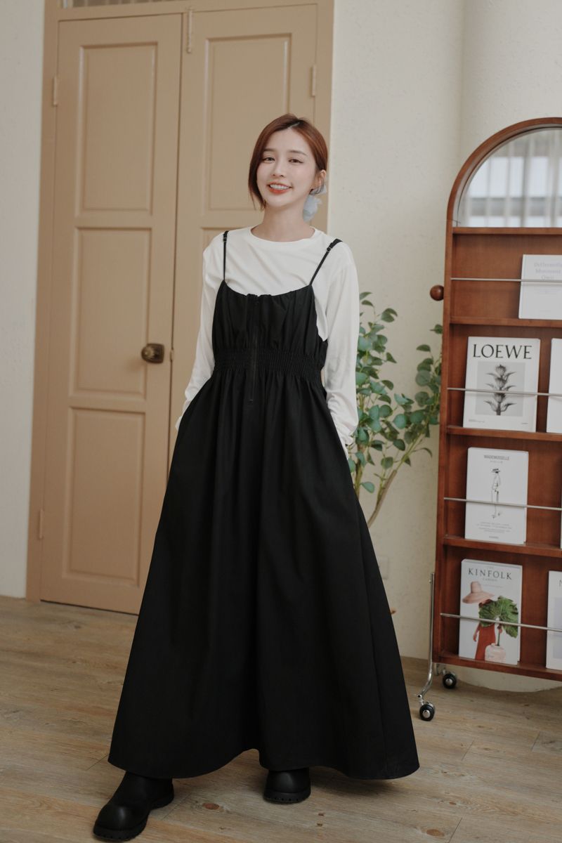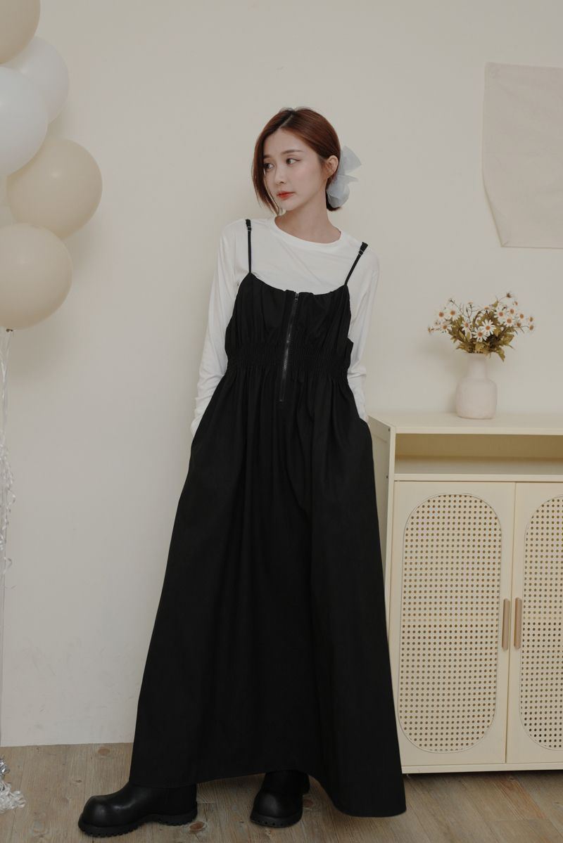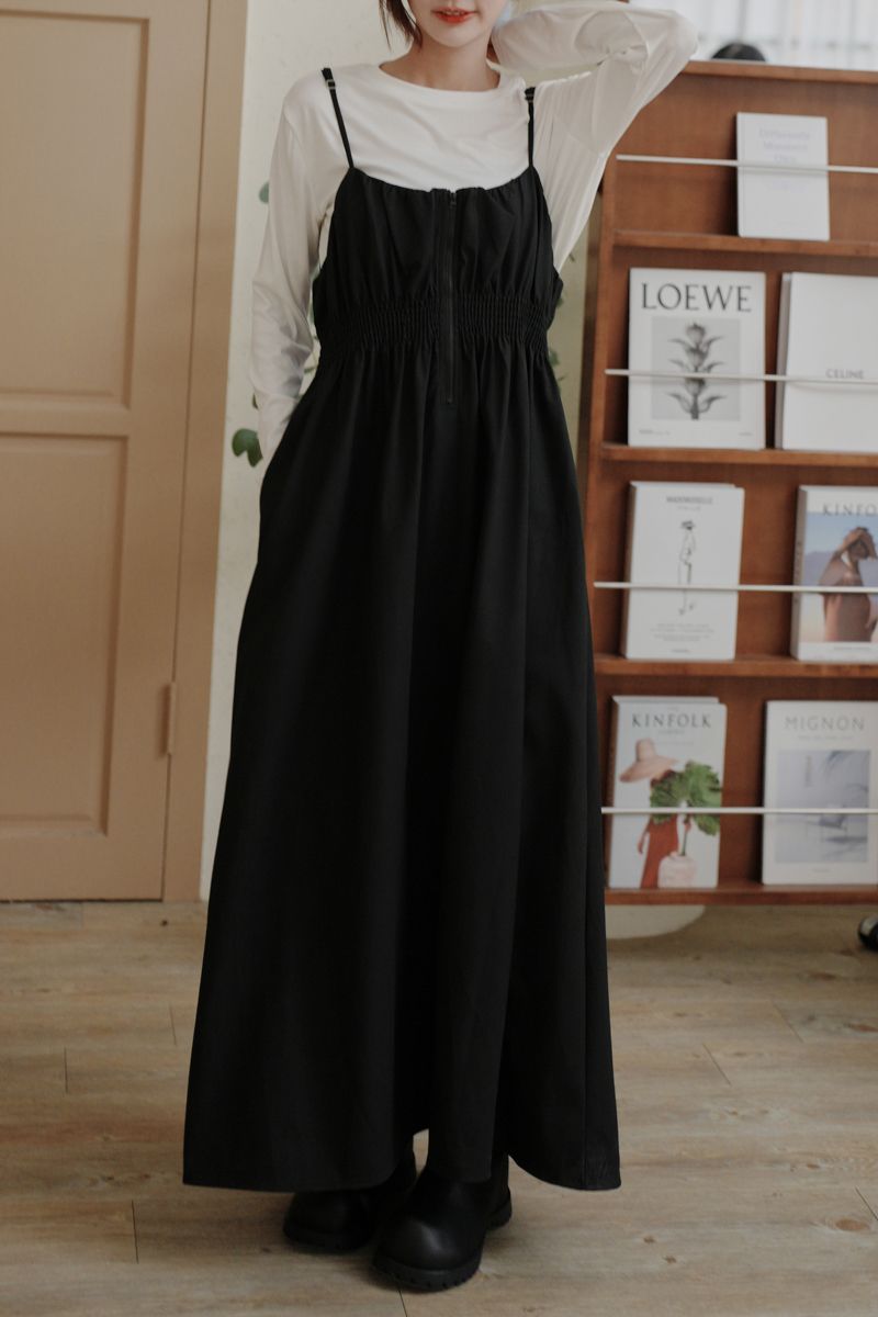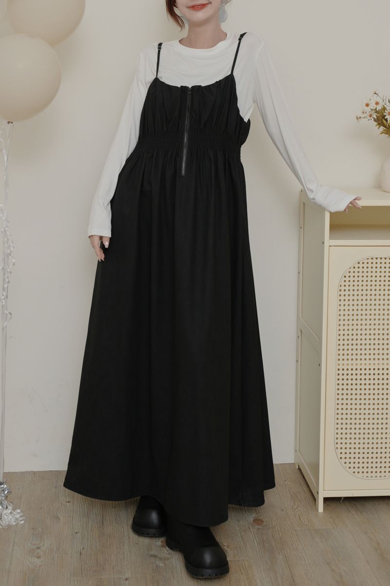 腰鬆緊細肩吊帶連身長洋(肩帶可調/胸前拉鍊)