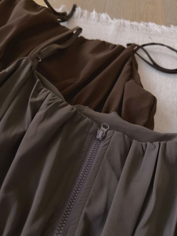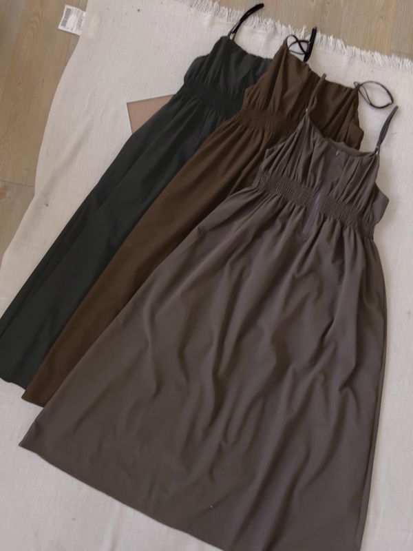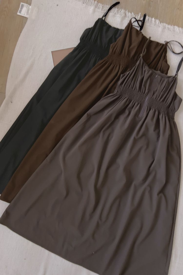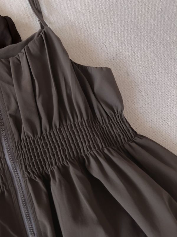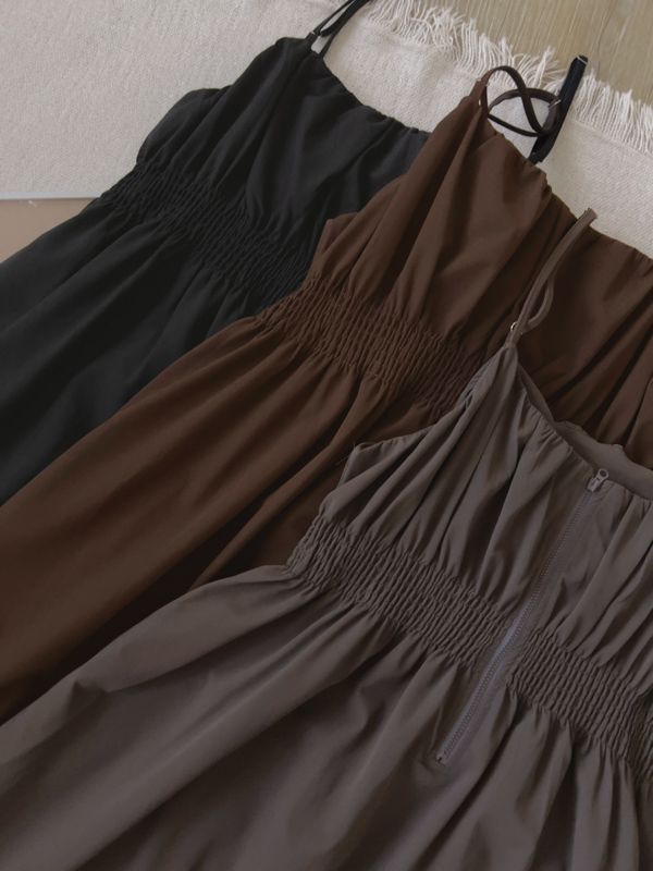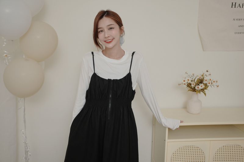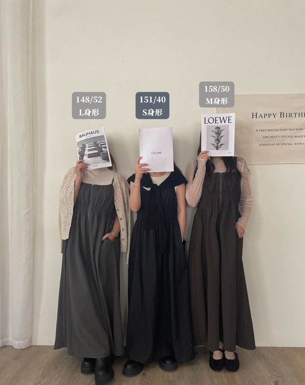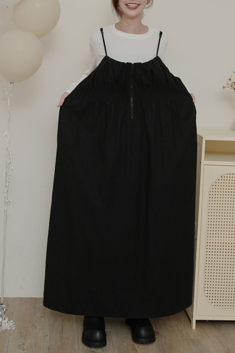 腰鬆緊細肩吊帶連身長洋(肩帶可調/胸前拉鍊)