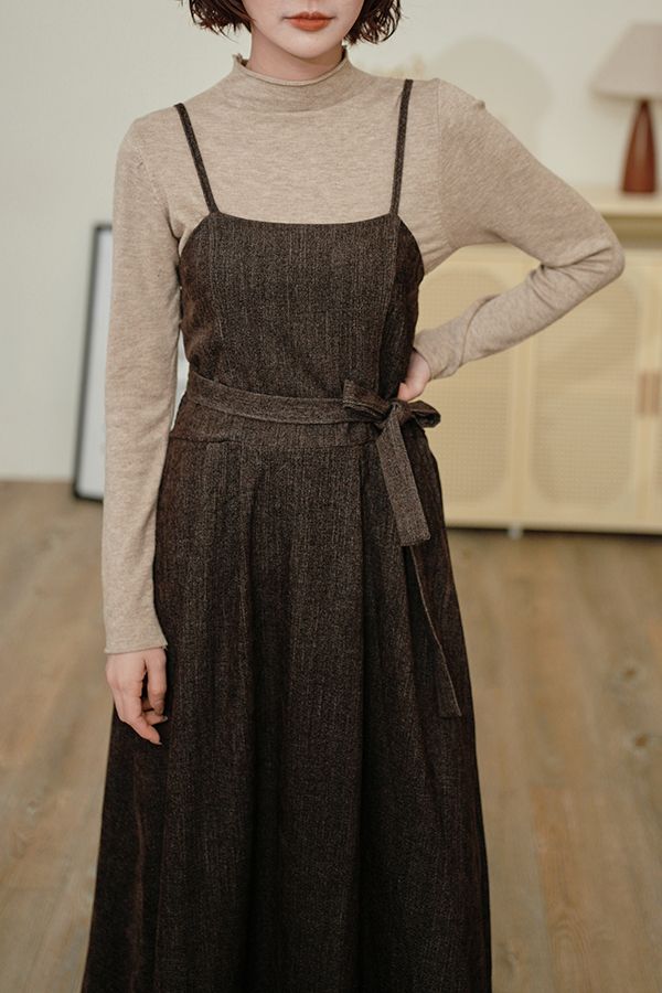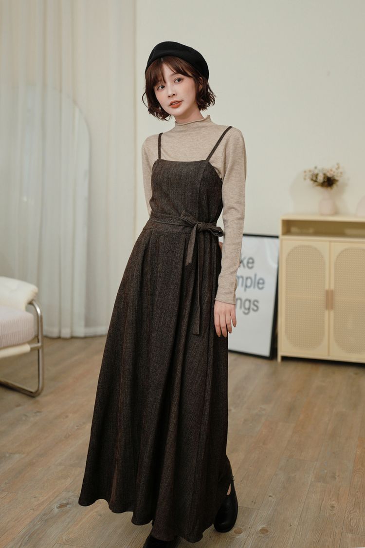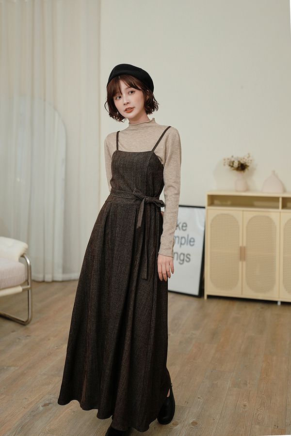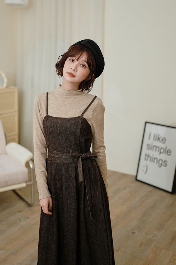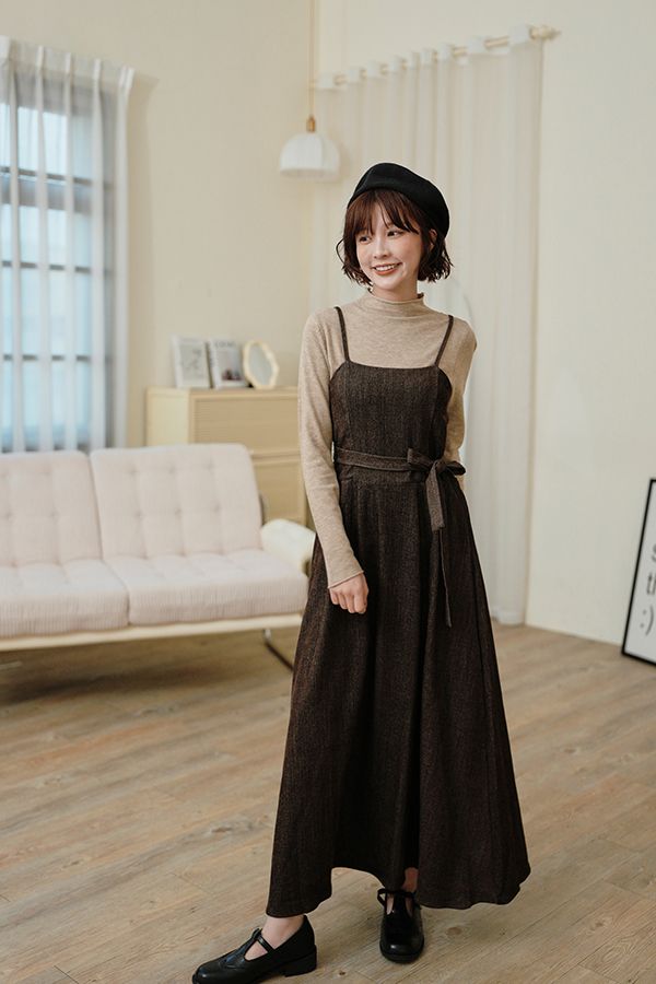 甜美復古長洋套裝(包芯紗上衣+細肩長洋+綁帶)