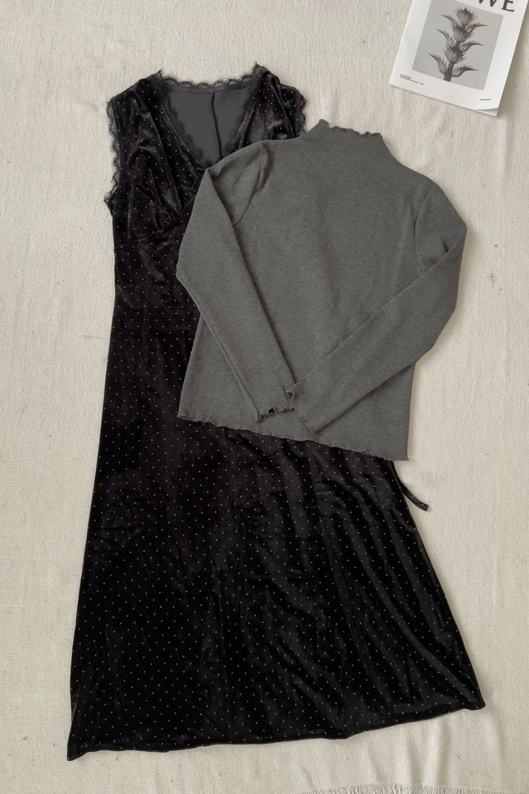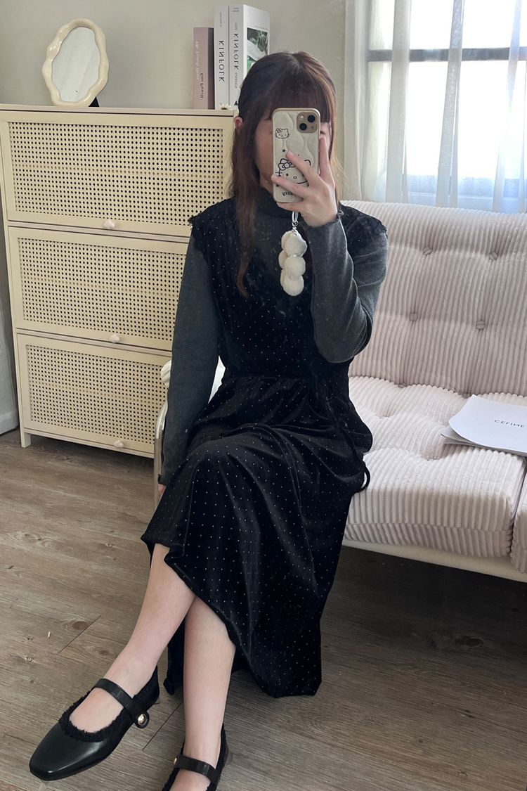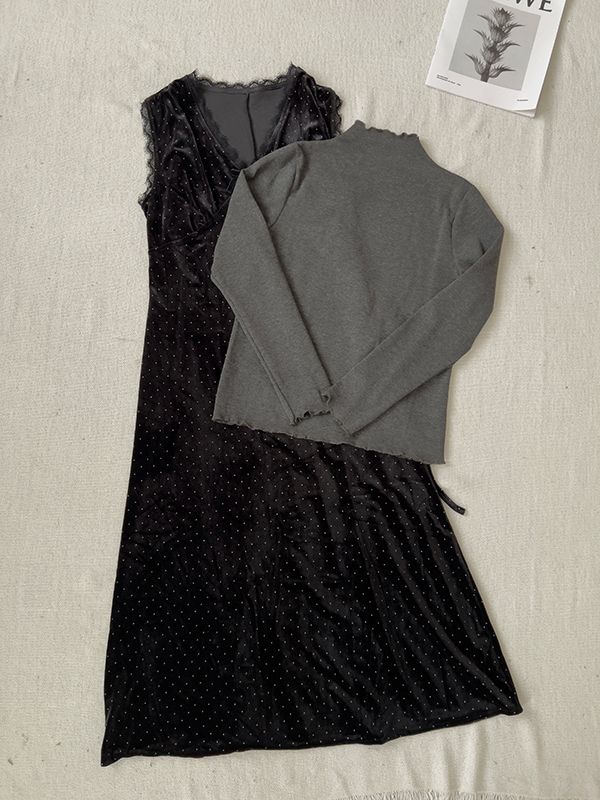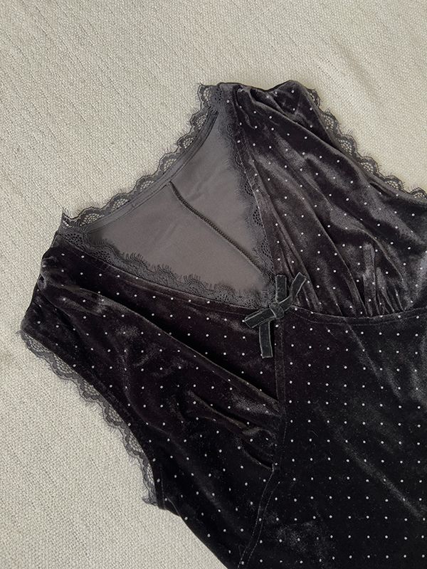 【限量現貨】蕾絲滾邊絨面點點套裝(長洋+上衣)