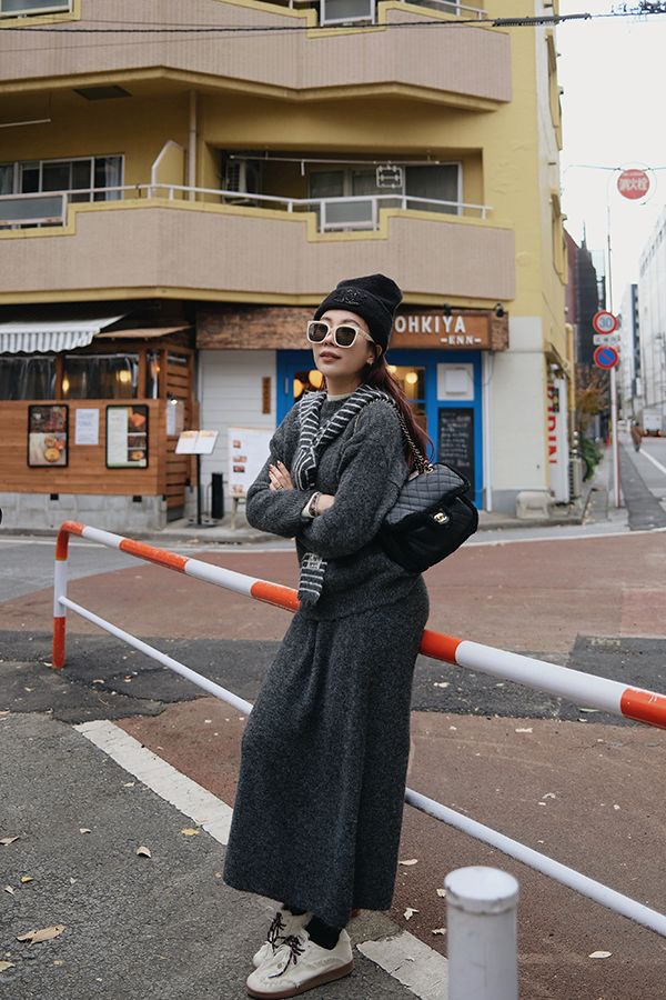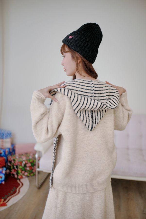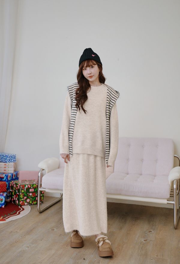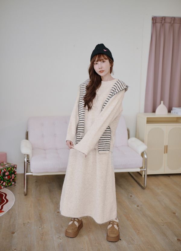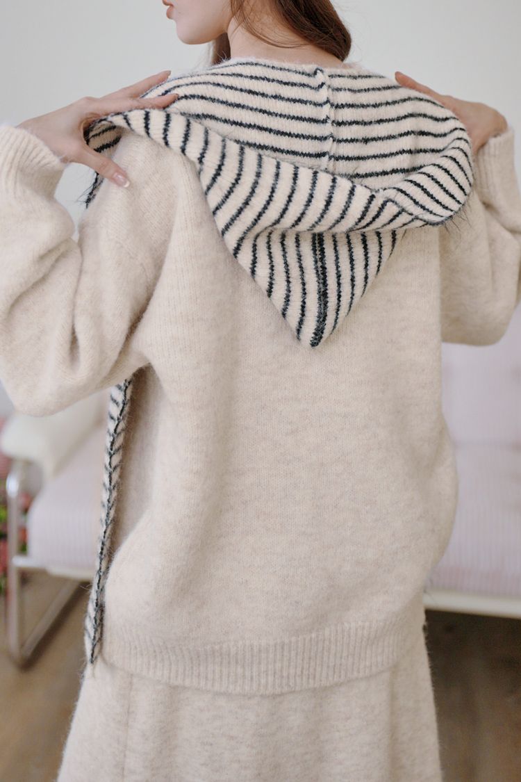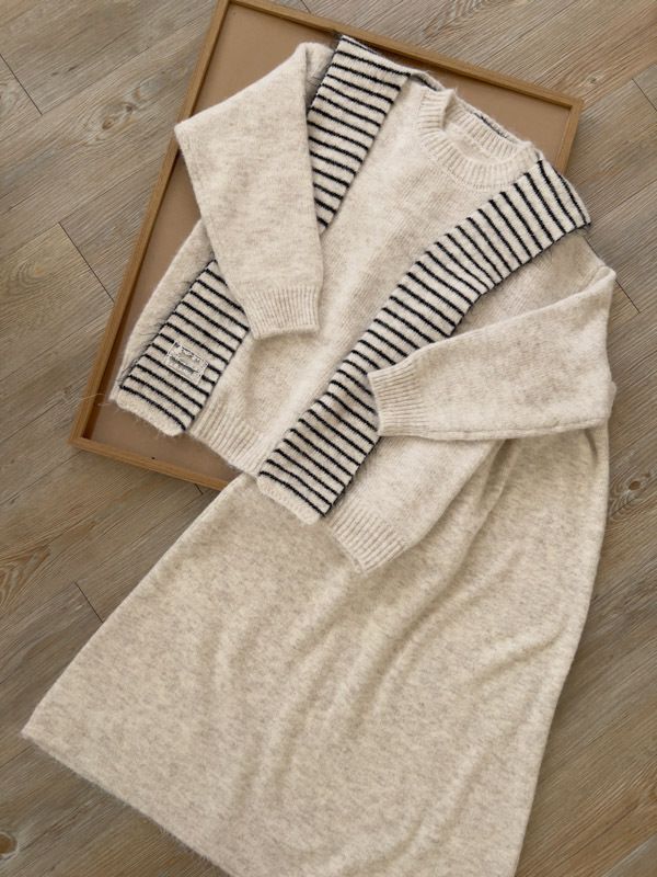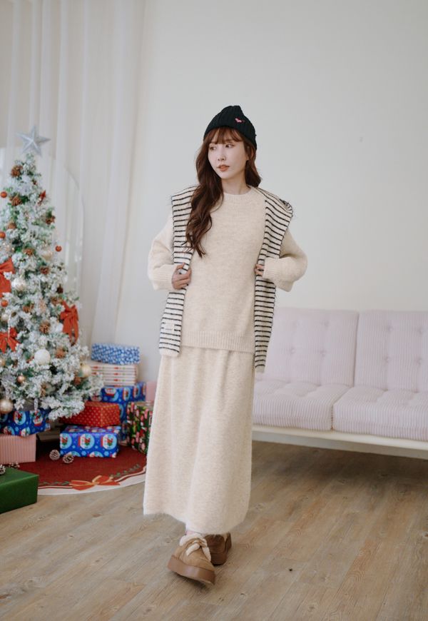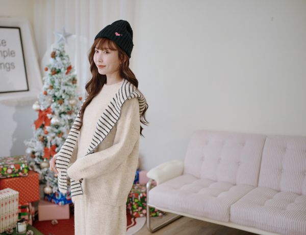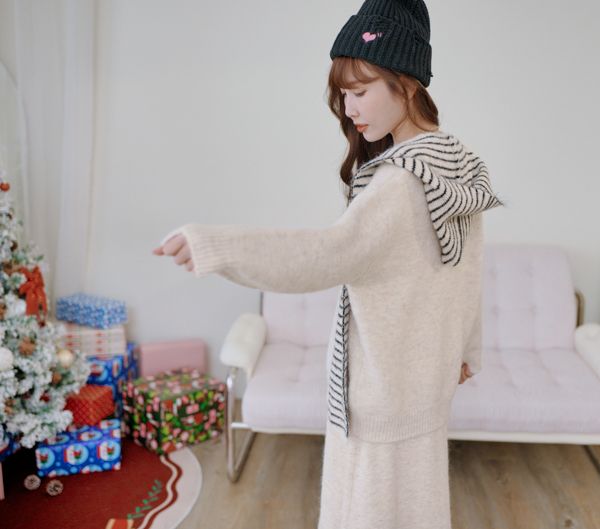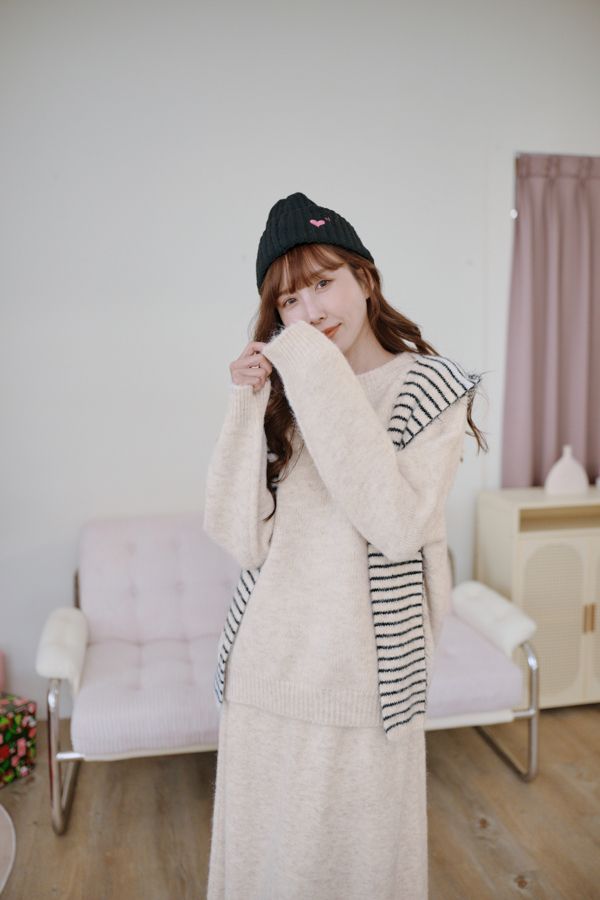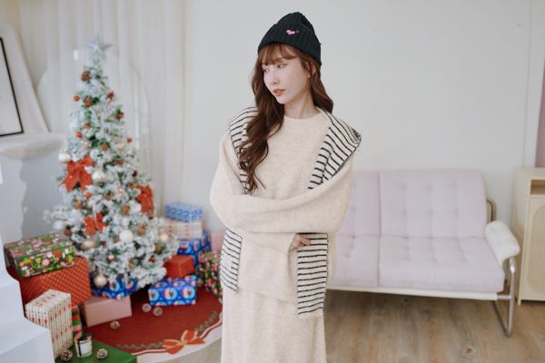 【東京旅拍】氣質針織套裝(連帽條紋披肩+上身+長裙)*3色