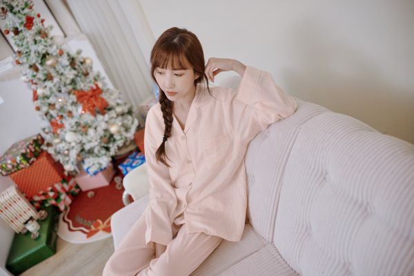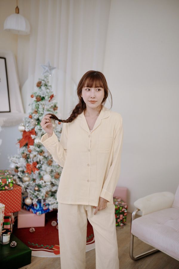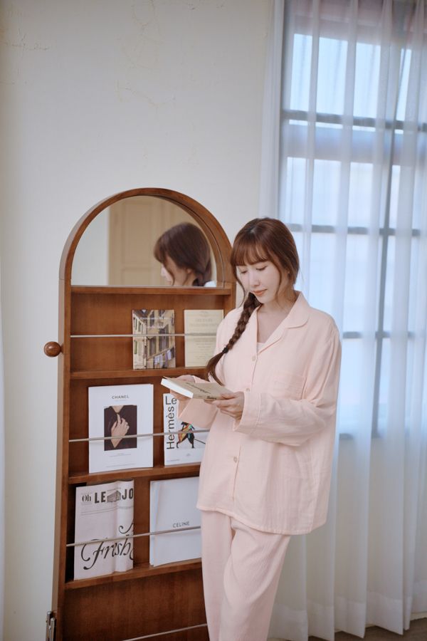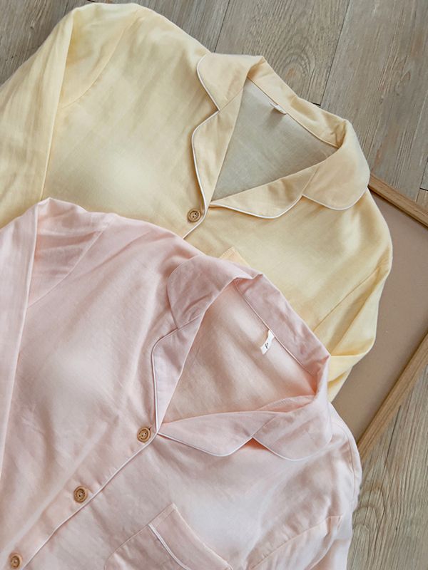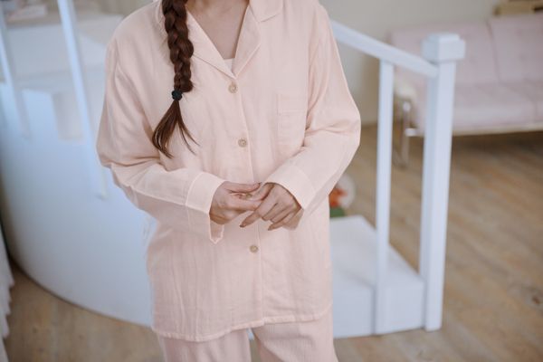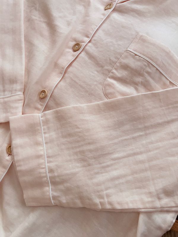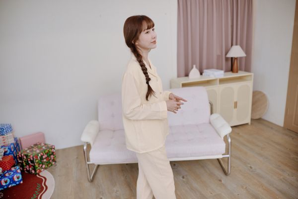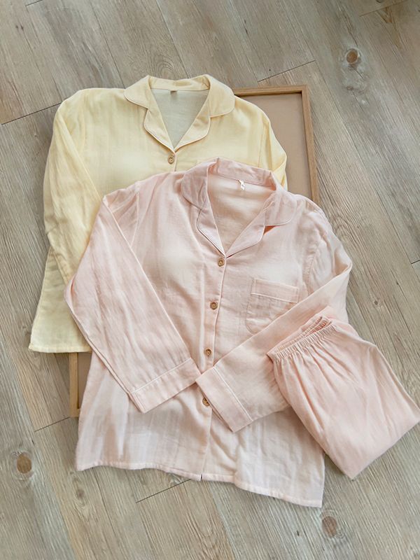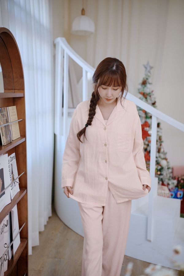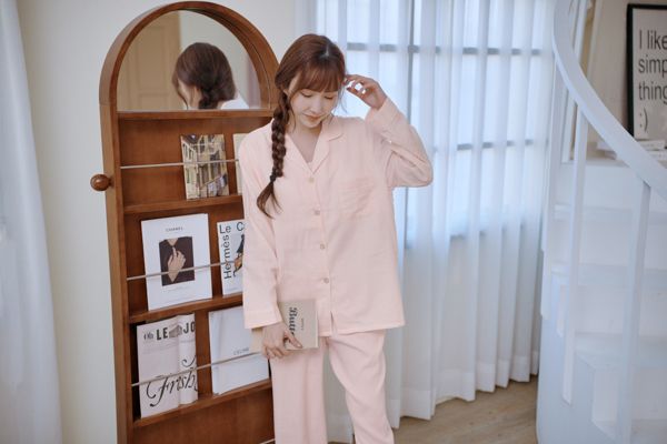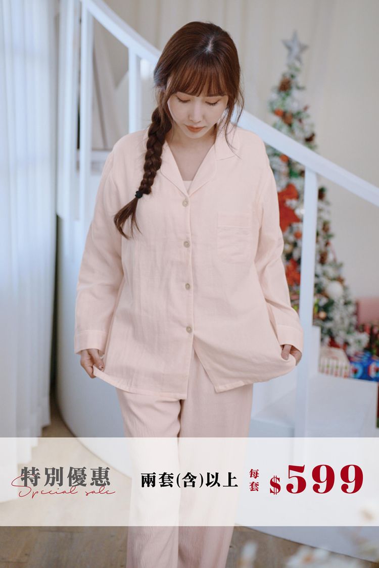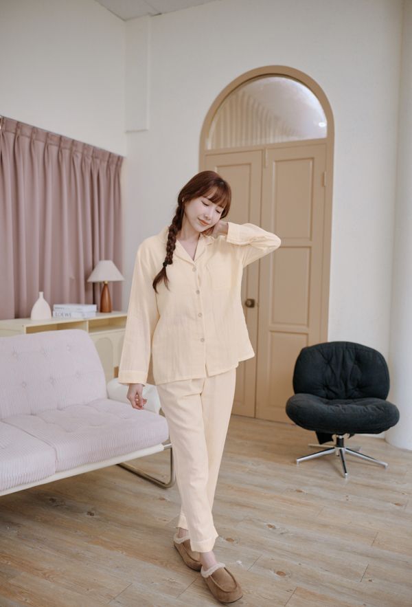字母釦雙層棉紗睡衣套裝*2色(上衣+長褲/有bra/固定)