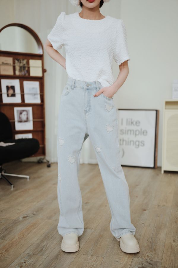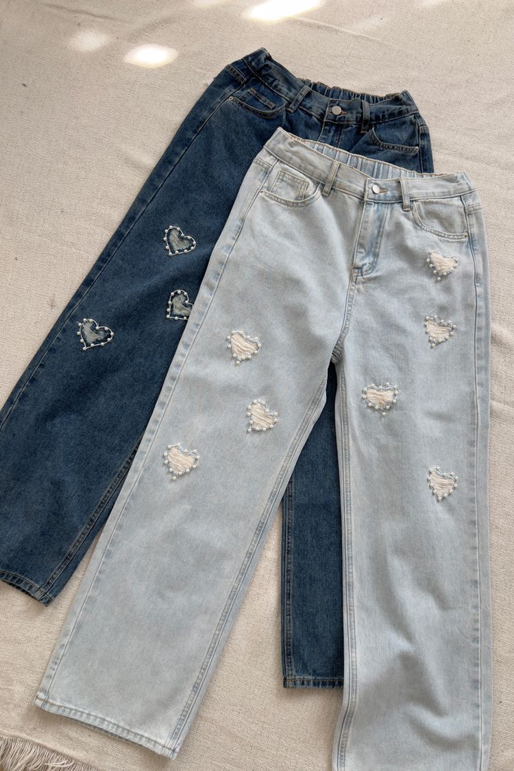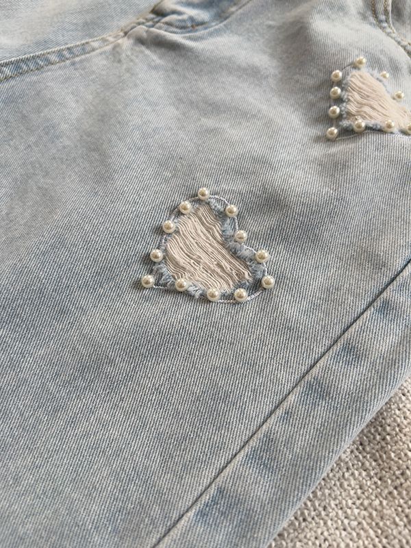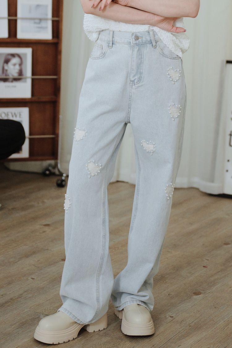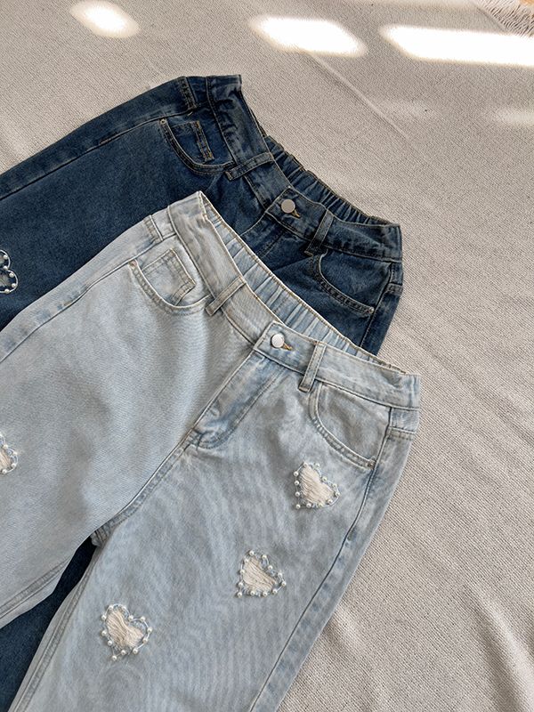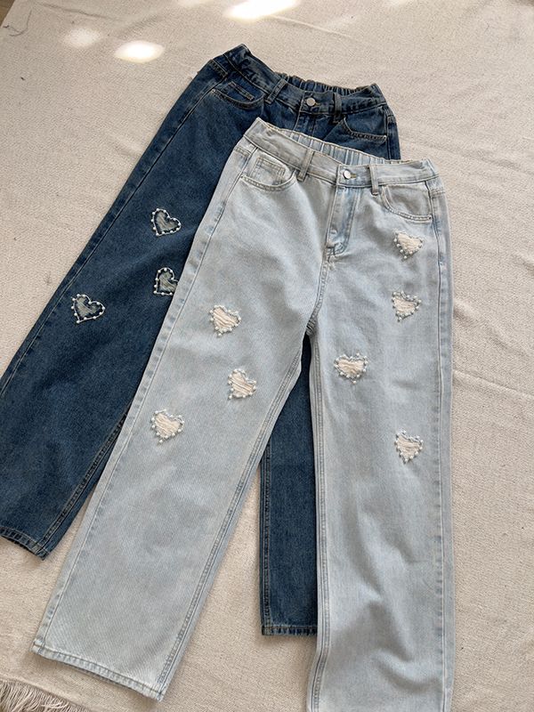 愛心珍珠刷破牛仔寬褲*2色(後鬆緊)