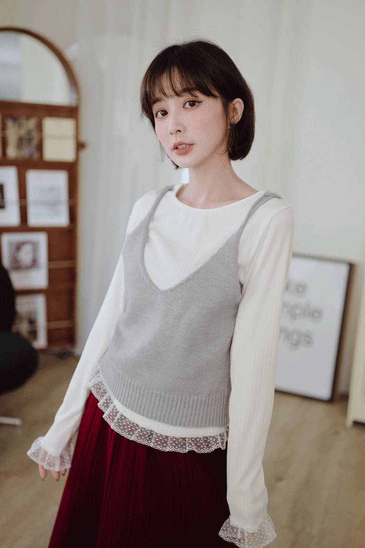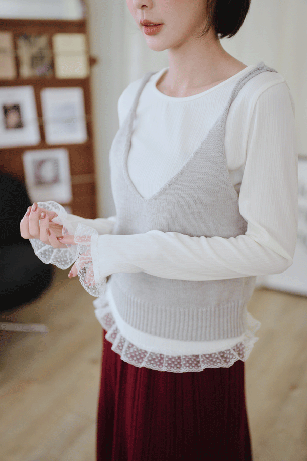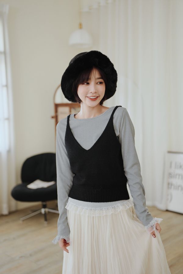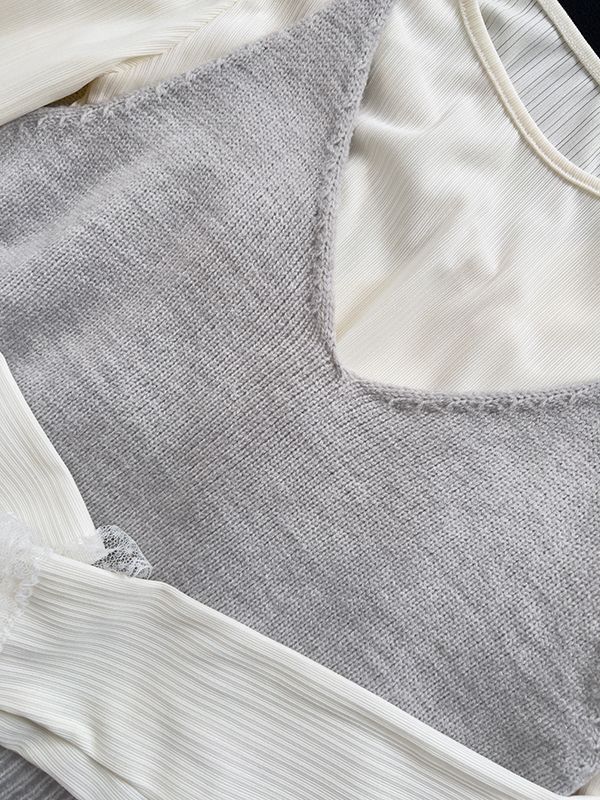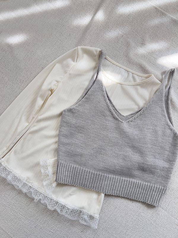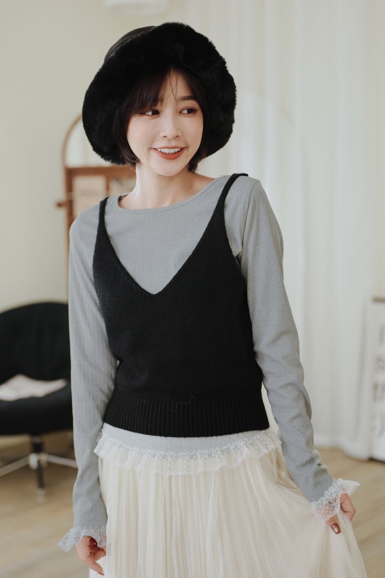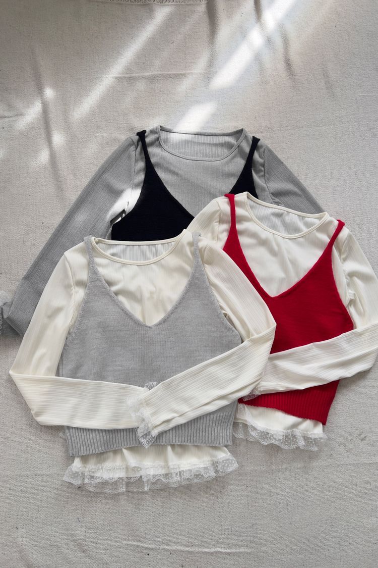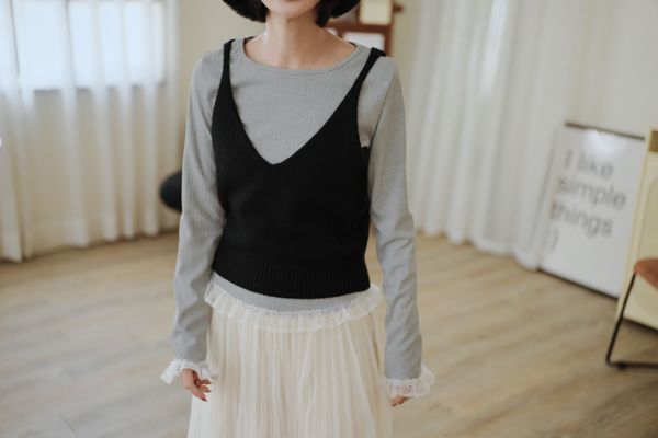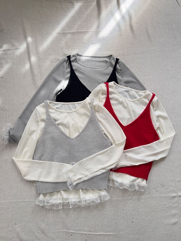 針織背心套組(蕾絲邊上衣+細肩背心)*3色