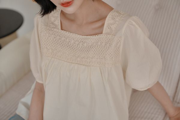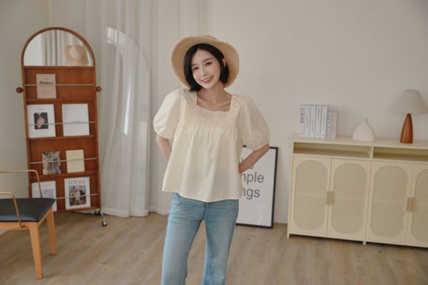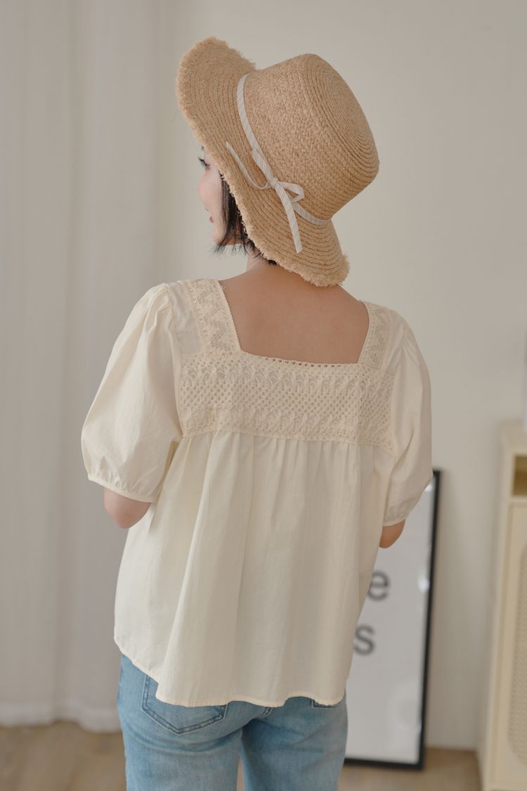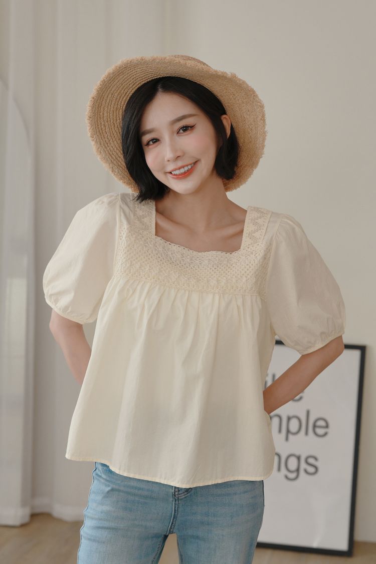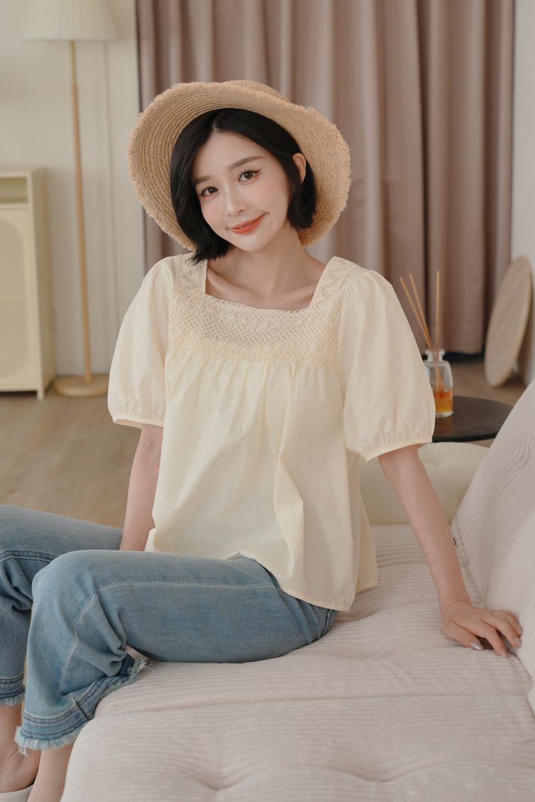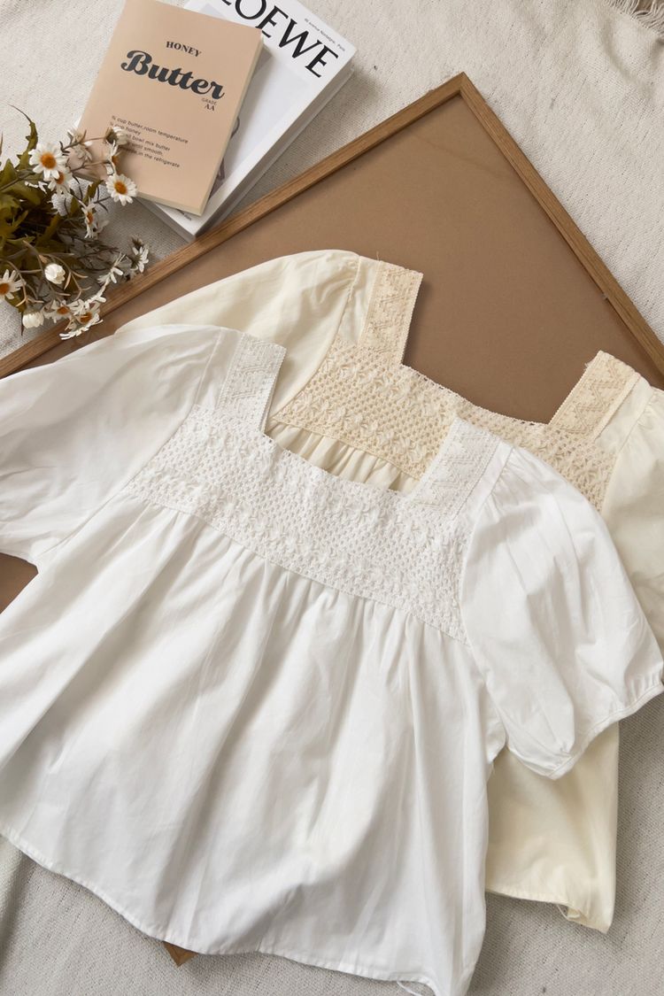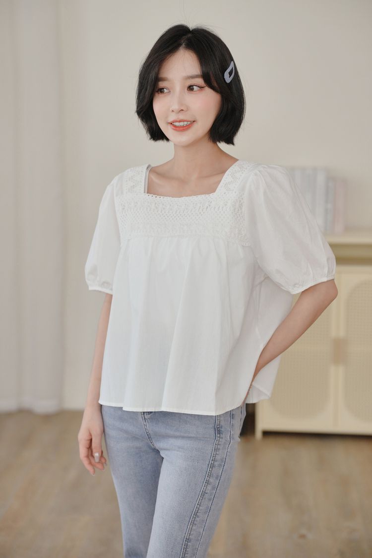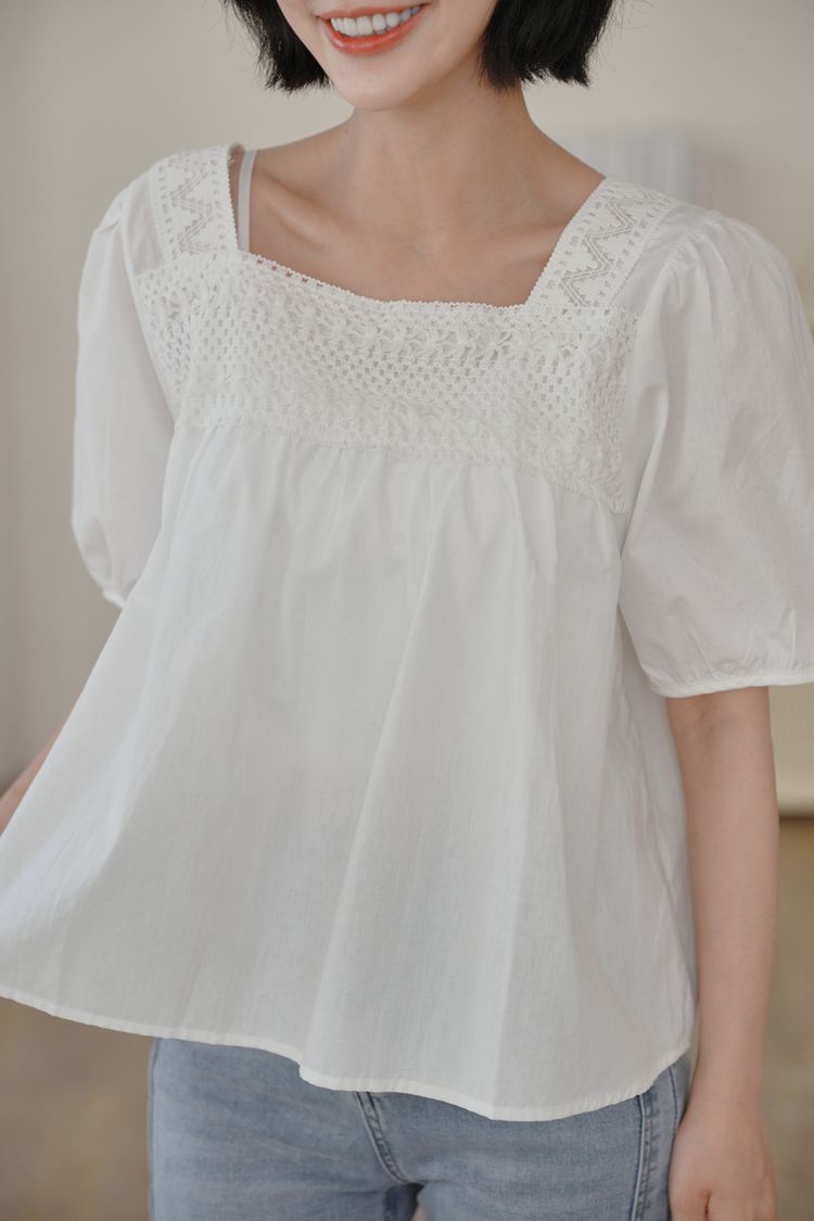 蕾絲方領短袖上衣*2色