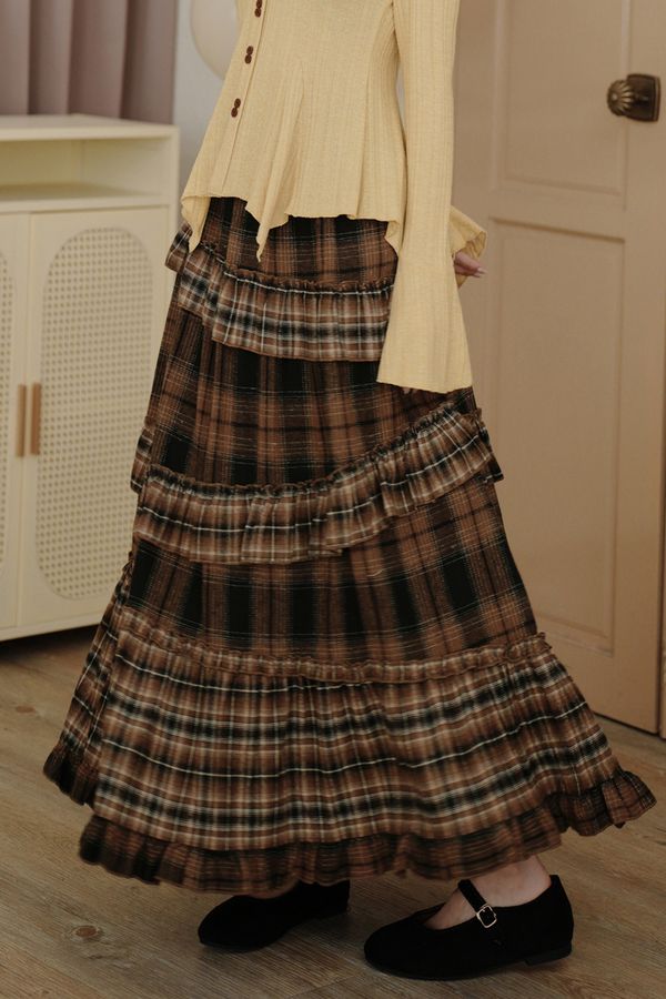 【限量現貨】毛呢不修邊下擺格紋傘裙