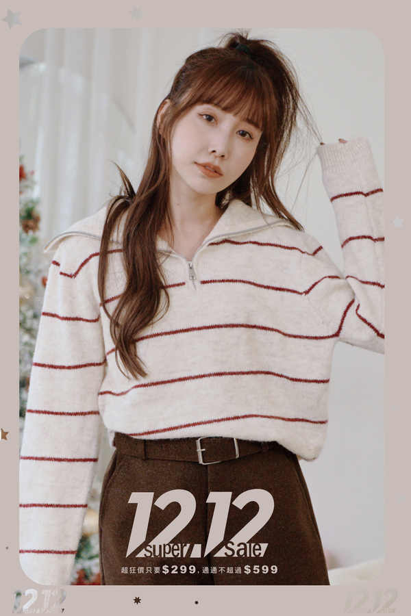 【雙12】條紋翻領拉鍊長袖針織上衣*4色