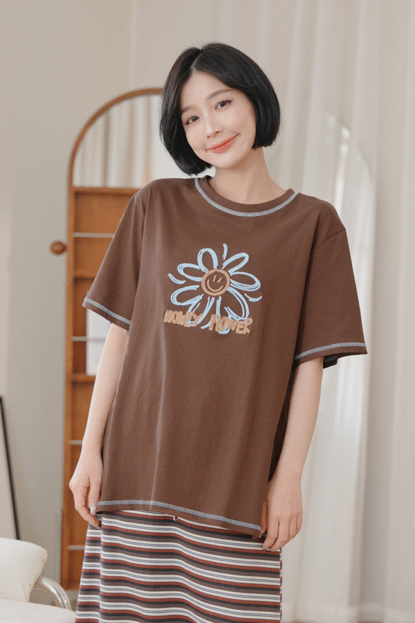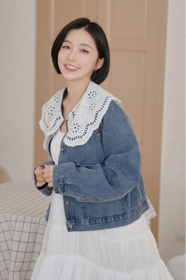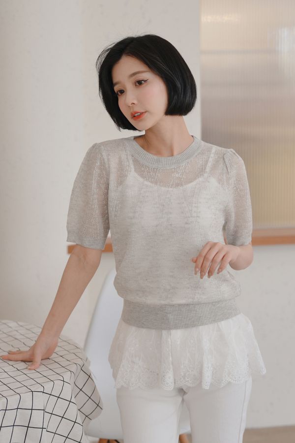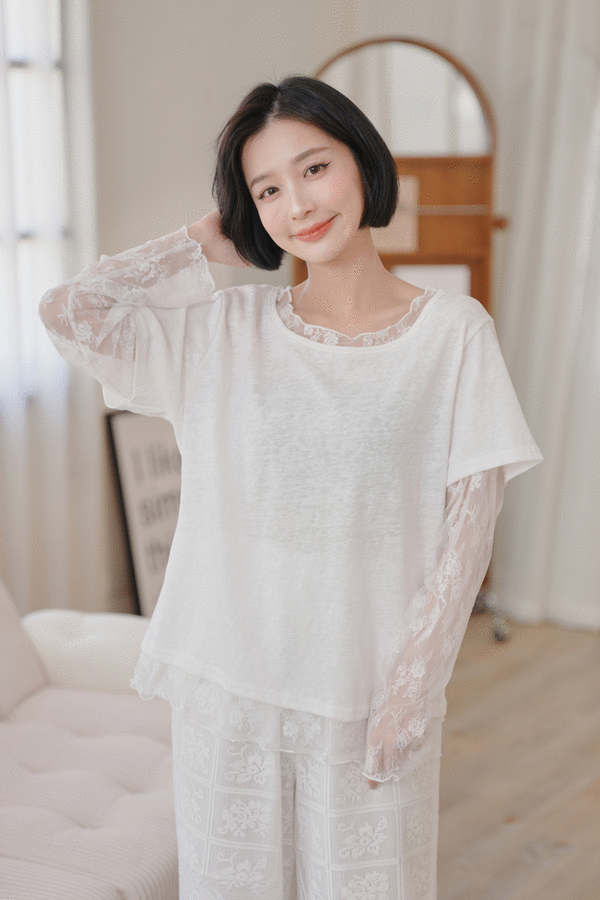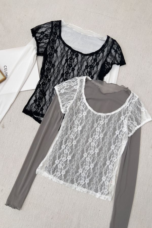 捲邊小花蕾絲上衣(短袖蕾絲+透膚上衣)*2色