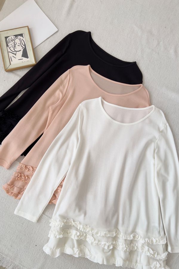 【限量現貨】初春圓領長袖荷葉下擺上衣/短洋*3色