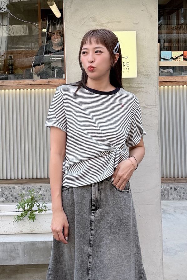 愛心刺繡撞色條文圓領上衣*3色